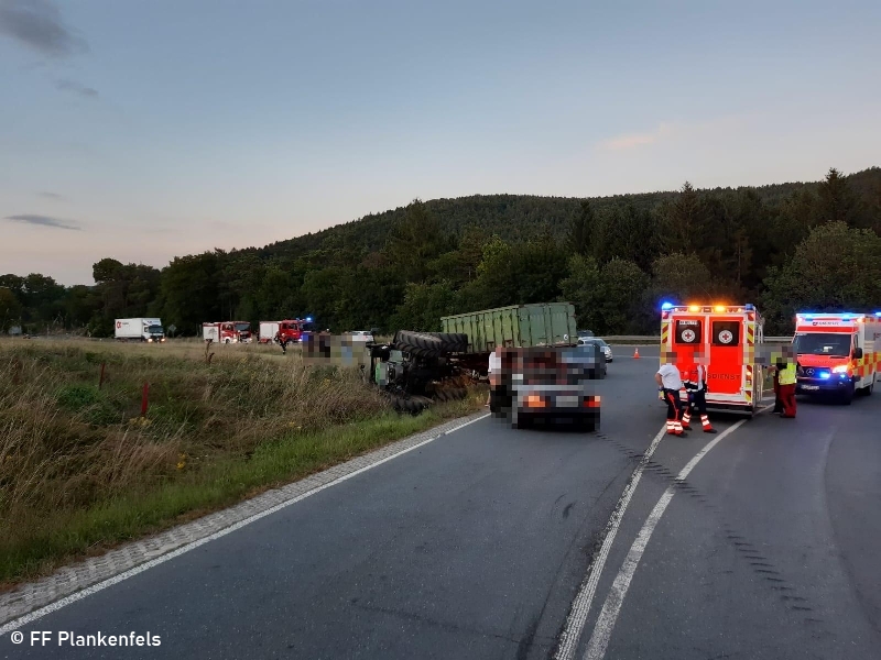 Kurz nach dem Ortsausgang Plankenfels kam ein Traktor mit Anhänger von der Straße ab und kippte um. Zum Glück wurde dabei niemand ernsthaft verletzt. Ein zufällig vorbeifahrender Ersthelfer ist selbst Notarzt, zudem kamen noch der Rettungsdienst und ein weiterer Notarzt per Hubschrauber, die den Fahrer des Gespanns erstversorgten.